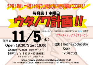 日時 : 11月5日(水) 場所 : 本厚木 y's SOUND BASE 時間 : OPEN18:30/START19:00 出演 : マジキッシュ/Bech&Zoolacebo/Cory 料金 : ¥2000+1ドリンクオーダー ※マジキッシュは20:20出演予定。 チケット取り置き予約をする