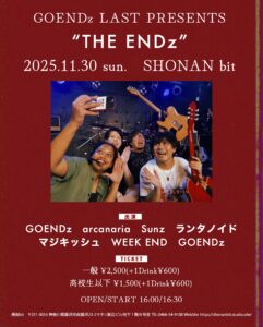 日時 : 11月30日(日) 場所 : 湘南bit 時間 : OPEN16:00/START16:30 出演 : マジキッシュ/GONEDz/Sunz/WEEK END/arcanaria/ランタノイド 料金 : 一般¥2500+1ドリンク¥600/高校生以下¥1500+1ドリンク¥600 ※マジキッシュは18:35出演予定。 チケット取り置き予約をする